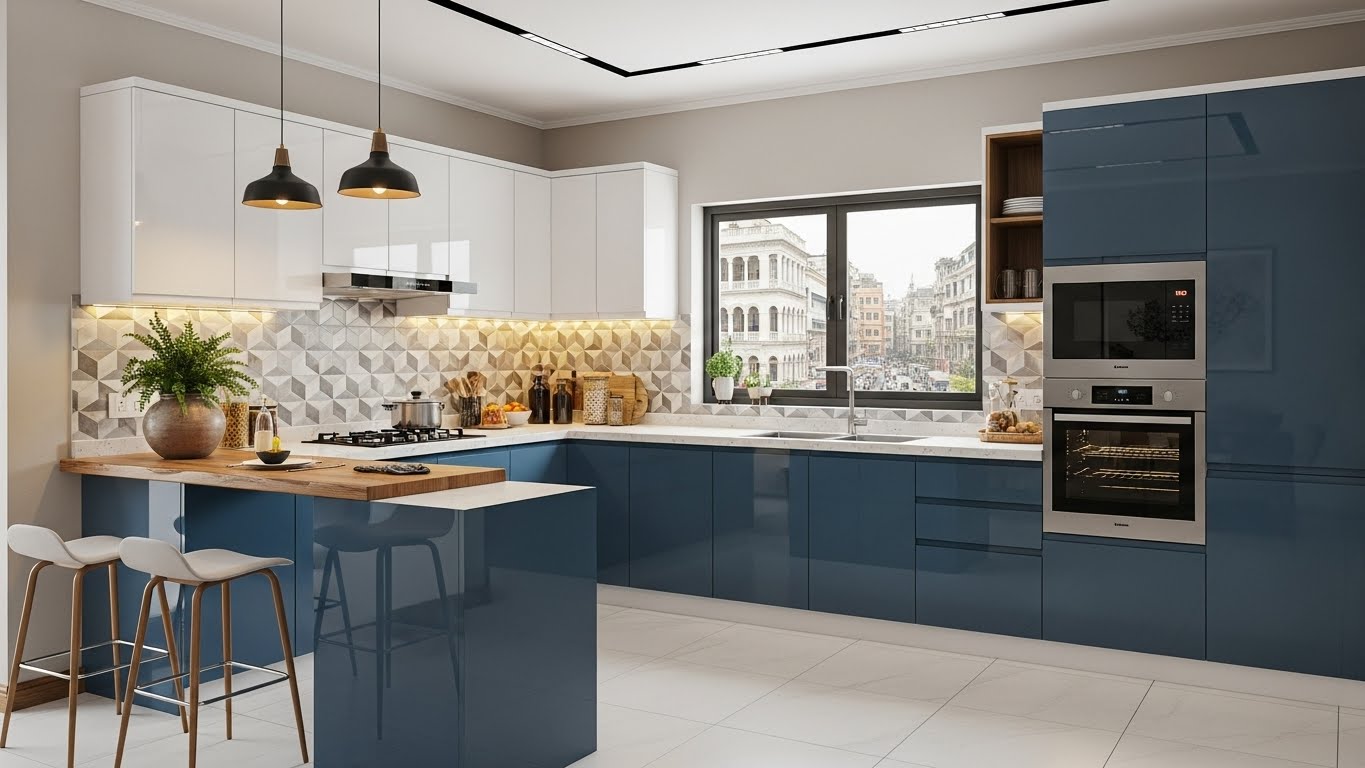 Kolkata homeowners are loving clean-lined designs with handle-less shutters, soft neutrals, hidden appliance units and open shelves mixed with closed storage. Straight and L-shaped layouts with breakfast counters, plus compact modular kitchen design for small kitchen in Kolkata, are especially popular in new flats.