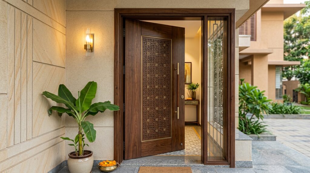 One of our recent projects in Behala had a gorgeous teak hinged door with brass handles for the main entrance. And let us tell you – every single guest who walked in complimented that door first. There’s something about a solid, beautiful hinged door that makes a statement.
