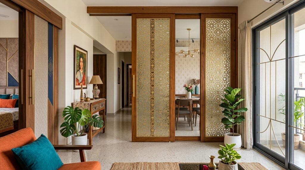 Sliding doors give you that clean, modern, minimalist vibe. Glass sliding doors especially – oh, they look absolutely stunning as balcony entrances or as room dividers between your living room and dining space. If you’re going for a contemporary look in your Kolkata flat, sliding doors just hit different.
