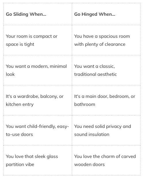 And honestly? The best homes we’ve designed in Kolkata use a mix of both. Sliding doors for wardrobes and balconies. Hinged doors for bedrooms and bathrooms. That’s the sweet spot. 👌