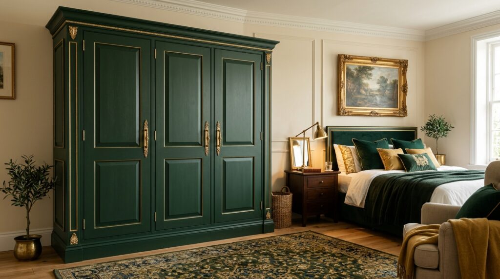 Luxury, luxury, luxury. This combination is for people who want their wardrobe to be the STAR of the bedroom. Deep forest green with gold handles or strips. Take a bow. 🌿👑