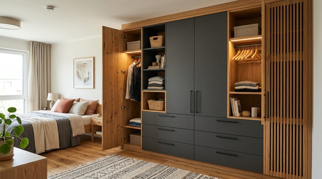 If you love that warm, woody look but don’t want the entire wardrobe to feel heavy, adding beige panels breaks it up beautifully. This combination feels grounded, cozy, and timeless. It’s one of those combos that looks good in 2024 and will still look good in 2034. No trend, no expiry date.