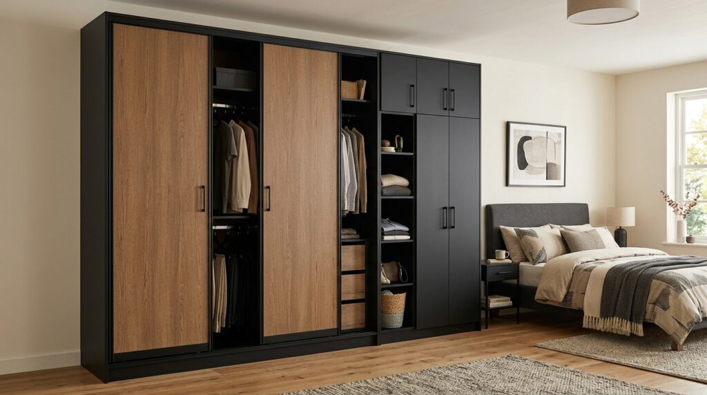 Earthy tan paired with sharp black edges. This combination has that leather-jacket-with-jeans energy. Casual but put together. Effortless but stylish. It works in bachelor pads, modern apartments, and even home offices where the wardrobe doubles as storage.