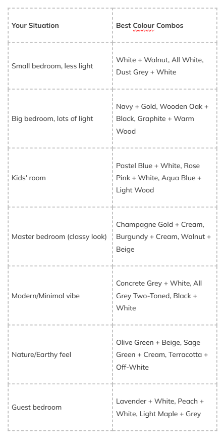 On the other hand, imagine a wardrobe colour that makes your bedroom feel bigger. Brighter. More “you.” That’s the power of choosing the right colour combination. It doesn’t cost extra. It doesn’t need extra space. It just needs a little thought.