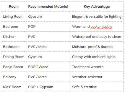 - Mix materials wisely: POP for shapes, gypsum for strength, PVC for wet areas.